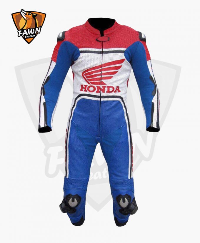 New design mens honda motorcycle leather suits are making for design for professional racer. This motorbike suit offers a safety and stylish look when you’re riding a bike and motorcycle. We use the high quality martial in our MotoGP clothing. Features in the 100% genuine Cowhide leather, Approved internal & external Protectors on Knee, Shoulder Elbows and Back, YKK Zippers for Performance, Outer Knee sliders for performance.