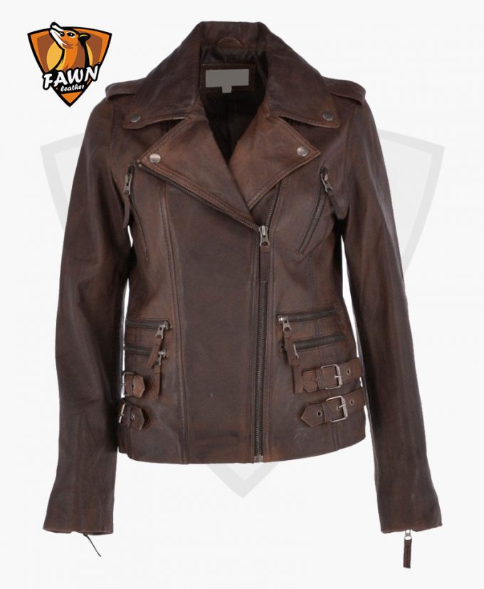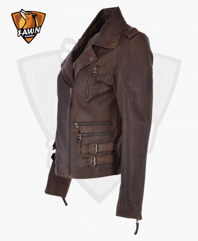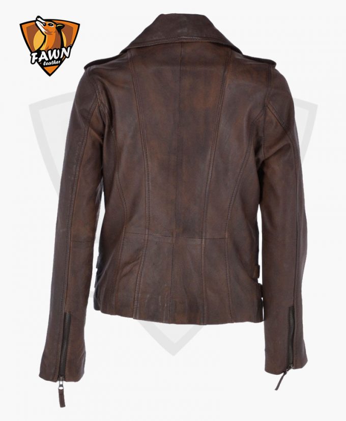New look women’s leather motorcycle jacket is especially design for ladies Racer. This biker jacket give a high proof security and modern look when you’re riding a bike and motorcycle. We use the high quality material in our leather jacket. Features in the leather jacket Premium quality, Regular Fit, Zip closure, Biker Sleeves, and dark brown color.