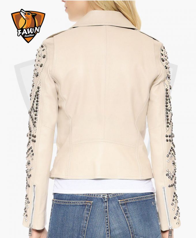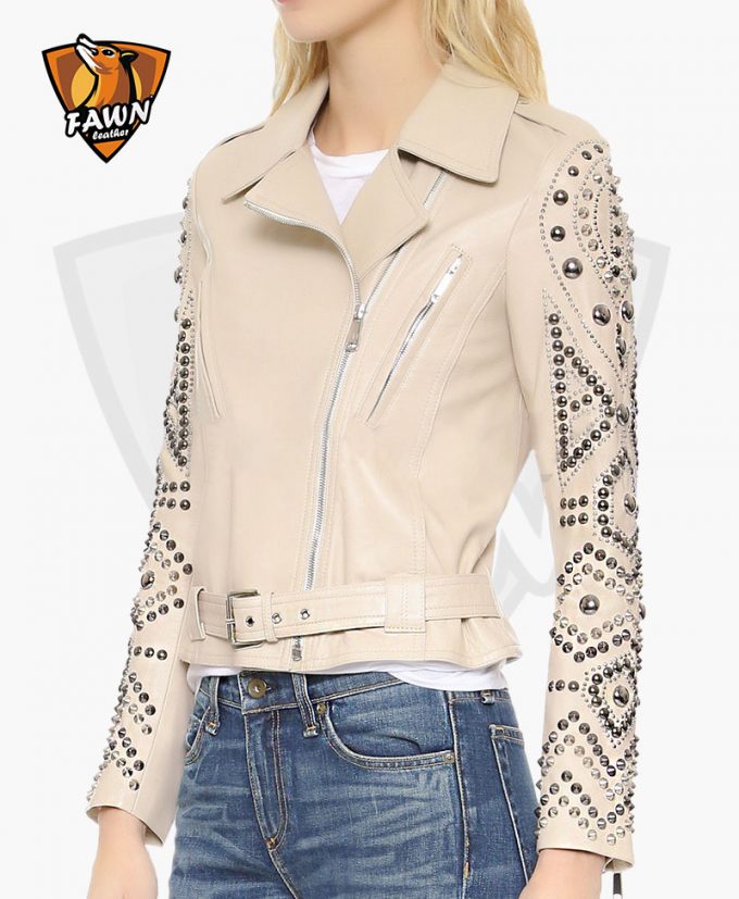 Punk style motorcycle womens studded leather jacket is unique, custom, and handmade piece from our jacket shop. It contains no harmful elements. You can wear this in every special event night, outs, camping, picnics, driving, and other occasions. We use the high quality material in our punk studded biker outfit. Features in the leather jacket Premium quality, Regular Fit, spiked style, Zip closure, and Cream Tonal color.