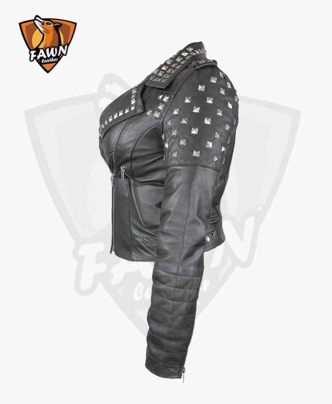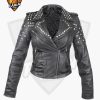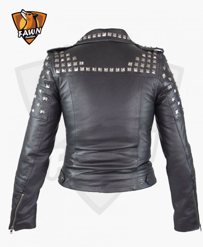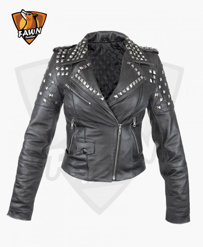 Real quality punk style womens studded leather jacket is unique, custom, and handmade piece from our jacket shop. It contains no harmful elements. You can wear this in every special event night, outs, camping, picnics, driving, and other occasions. We use the high quality material in our punk studded biker outfit. Features in the leather jacket Premium quality, Regular Fit, spiked style, Zip closure, and Black Color.
