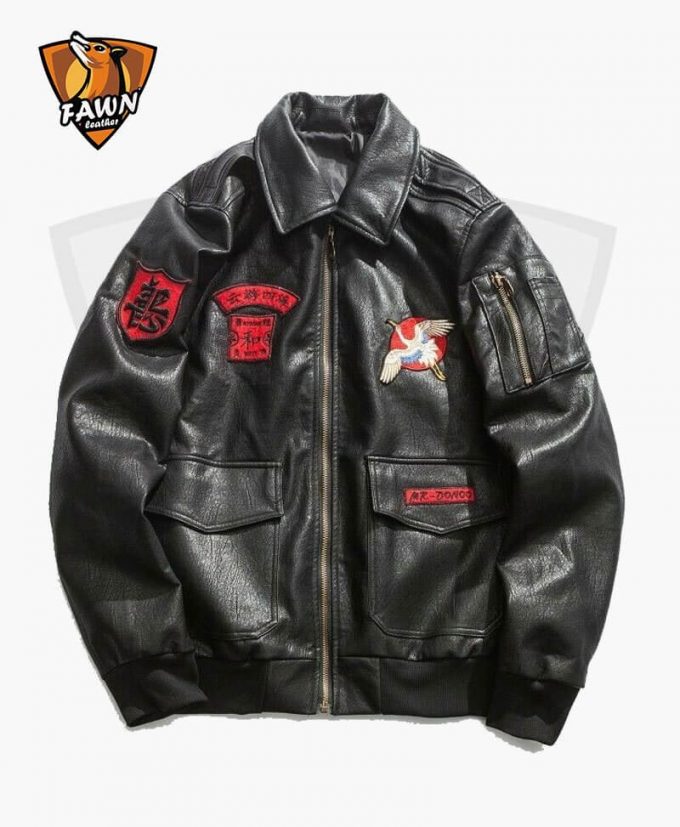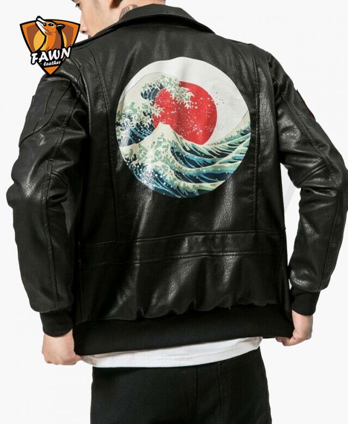Wave print crane embroidery printed leather jacket is made for branded person. This piece gives you special look. You can wear this in every special event. We use the excellent material in our leather outwear. Featuring a long sleeves, cuffs and side zipped pockets.